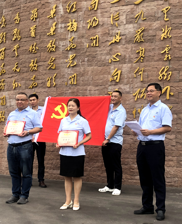 7月1日,中共四川飞球党委组织党员60余人前往江姐村(江竹筠故居)开展党建活动。在党委副书记曹国强带领下,大家随着蜿蜒向上的水泥大道来到一堵书写着红梅赞的岩墙之前,由党委委员黄志慧引领着朱春雷、李亚翠两名预备党员面对着鲜红的党旗进行了入党宣誓,“我志愿加入中国共产党,拥护党的纲领……” 铮铮誓言在活动现场回响激荡,现场的全体党员也纷纷举起拳头宣誓,重温着入党誓词。