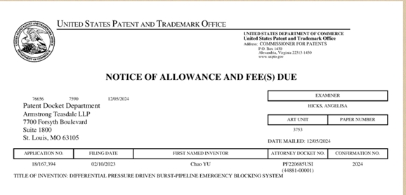 本网讯(曾小舸报道)12月5日,3044am永利集团高新技术研究院申报的发明专利“压差驱动管道爆破应急阻断系统”成功荣获美国发明专利授权。