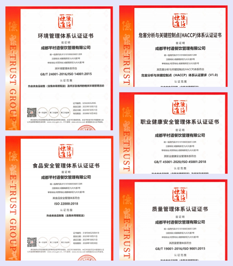 本网讯(周青报道)近日,成都芊村道餐饮管理有限公司(以下简称“芊村道”)凭借严格的管理标准、卓越的产品品质与完善的服务体系,成功取得ISO9001质量管理体系、ISO14001环境管理体系、ISO45001职业健康安全管理体系、ISO22000食品安全管理体系及HACCP危害分析与关键控制点体系五大体系认证证书。这五大体系认证作为国际通用的权威标准,涵盖质量管控、环境责任、员工健康、食品安全等核心维度,是衡量企业综合实力与合规运营能力的“硬指标”,标志着企业管理水平与运营规范度达到行业先进水准。