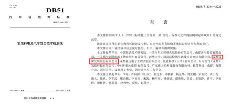 在积极参与国家标准制定的同时,成都成保也致力于地方标准的创新与实践。由该公司参与起草的四川省地方标准DB51/T 3344《氢燃料电池汽车安全技术检测线》已于2025年底正式发布实施。